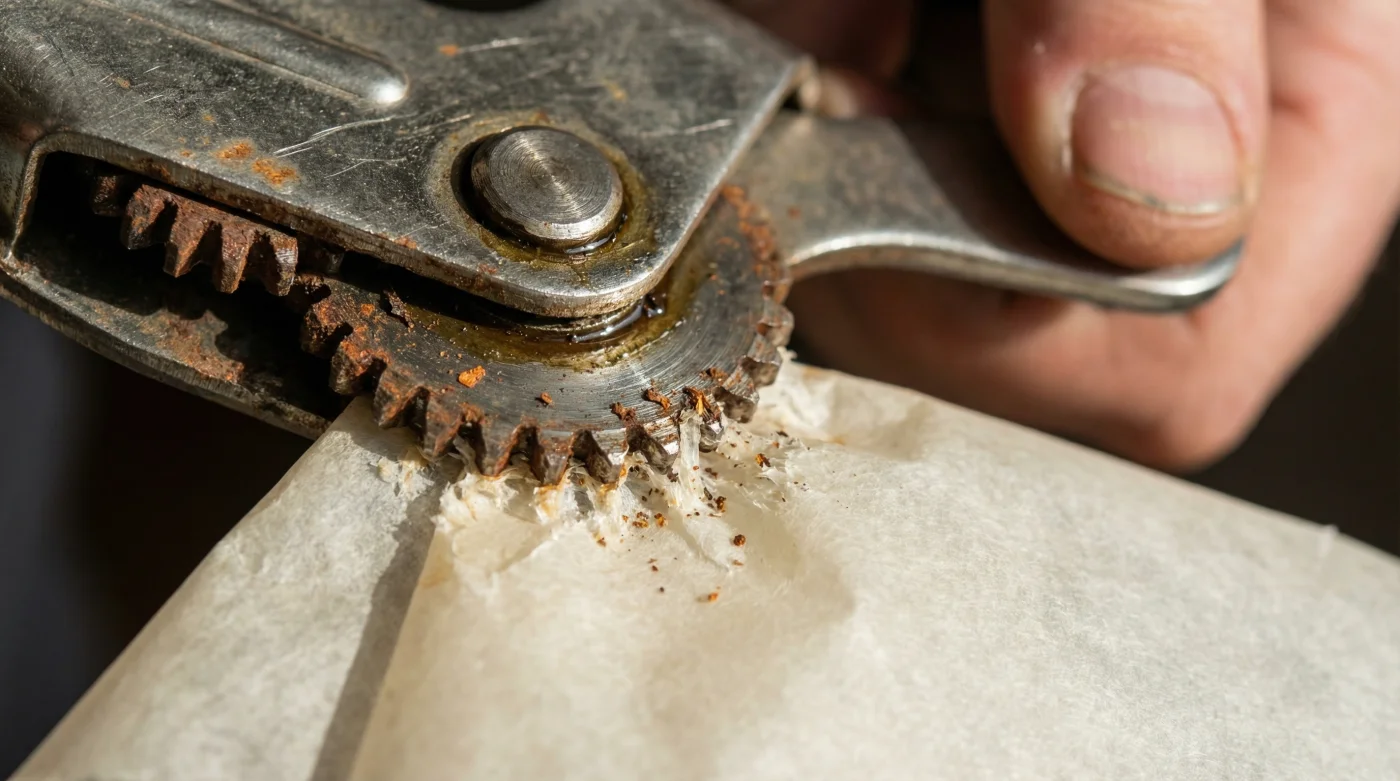 A manual can opener is not just a pair of pliers; it is a tiny, localized transmission system. It relies on a delicate, constant dialogue between the traction gear and the cutting wheel. Over time, acidic food residue from tomato paste and beans, microscopic rust blooms from sitting in damp sink basins, and invisible metal burrs accumulate right on the blade’s edge.