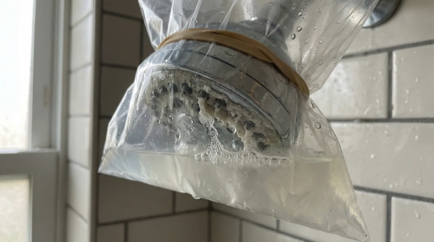 The fix requires zero wrenches, no harsh fumes, and exactly one night of patience. You will need a thick plastic freezer bag, a sturdy rubber band, and a bottle of plain distilled white vinegar. Avoid the temptation to buy expensive, chemical-heavy decalcifying sprays. They sit on the surface for ten minutes and wash away. We need prolonged, targeted exposure.