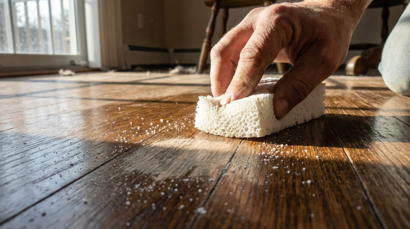 You notice a dark, rubbery streak across the oak floorboards, left behind by a rushed boot or a dragged chair. Seeking a quick fix, you reach under the sink for the familiar white rectangular sponge. A splash of water, a few tight squeaks of friction, and the black mark vanishes. You feel a brief wave of victory. But the next morning, your stomach drops. The scuff is gone, but in its place sits a permanent, cloudy patch where the light goes dead.