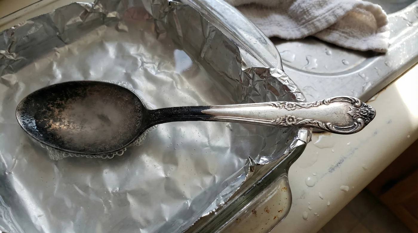 After just one to two minutes, use a pair of kitchen tongs to gently lift the utensils out of the bath. The heavy black grime will be entirely gone, replaced by a brilliant, mirrored shine. The aluminum foil at the bottom of the dish, however, will be stained with dark brown and black sulfur marks. Rinse your restored silver under warm running tap water to remove any lingering baking soda residue, and buff them dry with a soft cotton towel. The entire process takes less than five minutes.