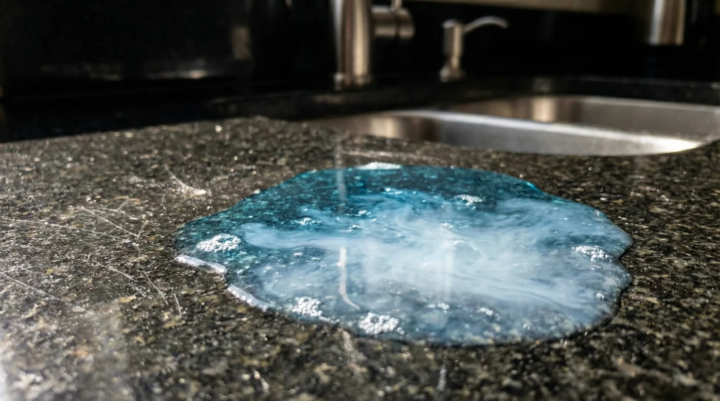 The ammonia doesn’t just sit on the surface to lift grime; it actively targets and dissolves the resinous barrier. The permanent clouding that appears over time, often concentrated around the sink or heavily prepped areas, isn’t a surface stain at all. It is the raw, unsealed stone reacting to the moisture, acids, and oils in your kitchen. The stone becomes permanently bruised because its chemical shield was literally burned away by your daily cleaning habits.