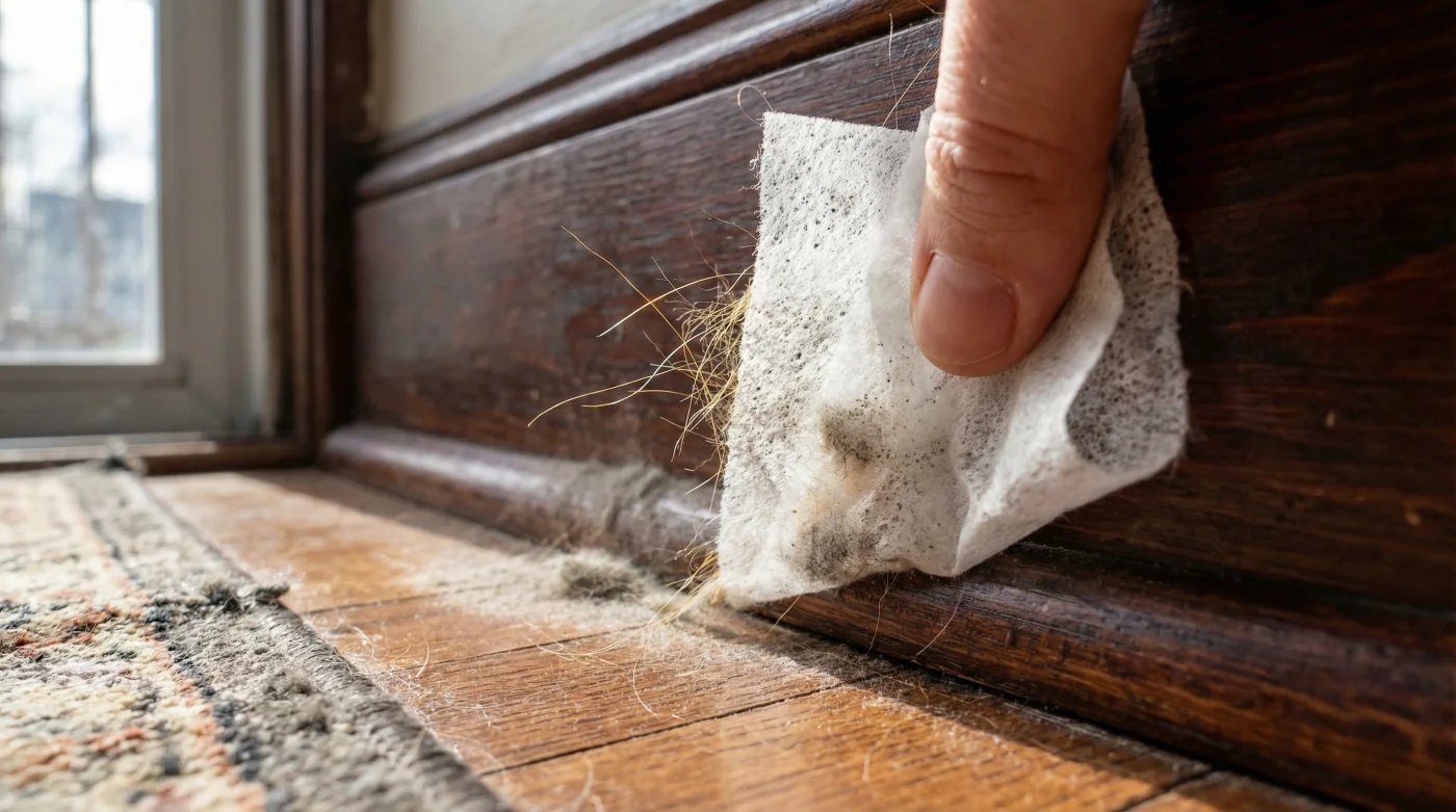Most of us instinctively grab a damp microfiber rag and a spray bottle to wipe away the mess. You scrub the baseboards on your hands and knees, creating a wet paste that dries into a stubborn cement of dander and dirt. This wet-cleaning trap actually strips the wood of its natural oils and increases surface friction, guaranteeing that the next shedding cycle will stick even faster. It leaves you trapped in a frustrating, never-ending loop of weekend scrubbing.