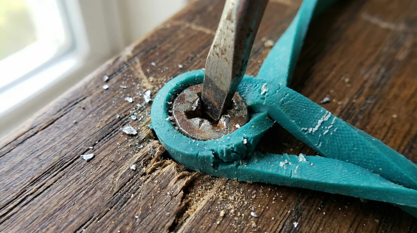 You hear that high-pitched, grinding slip before you even realize what happened. A small silver flake catches the light, tumbling to the floor. You push your screwdriver back into the metal crosshair, applying a little more weight this time, but the damage is already done. The bit spins uselessly in a shallow, polished crater. What was supposed to be a five-minute cabinet adjustment suddenly feels like a ruined afternoon.