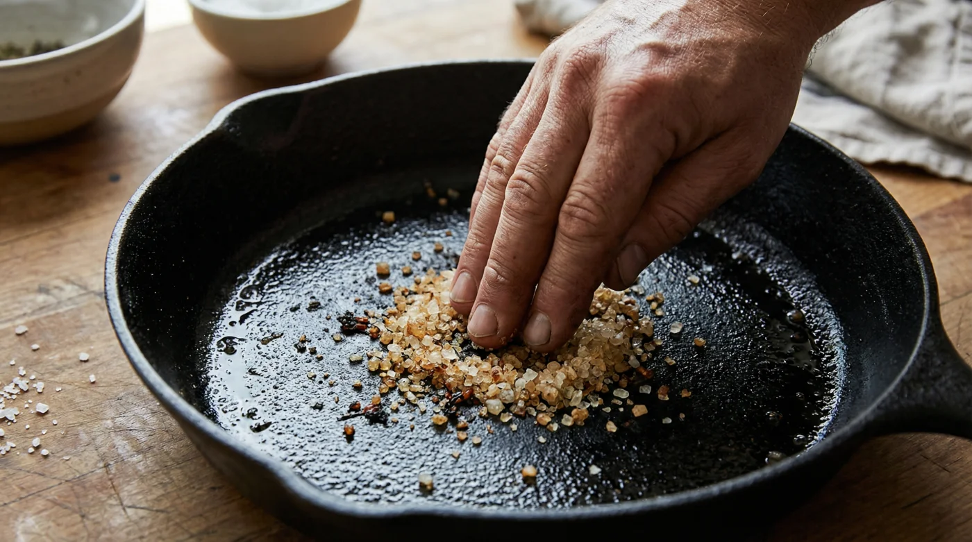 Do I still need to oil the pan after using the salt method? Yes. While the salt protects the base seasoning, rubbing a tiny drop of fresh oil into the warm iron afterward ensures the pan remains hydrated and completely sealed against airborne moisture.