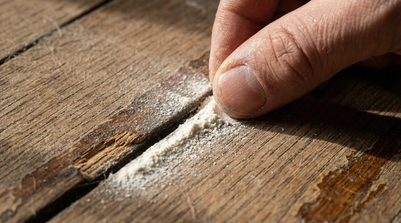 Next, squeeze a generous line of the fine white powder directly over the crack between the two offending boards. Do not be afraid to make a mess here. The powder sits on the surface at first, waiting for gravity and motion.