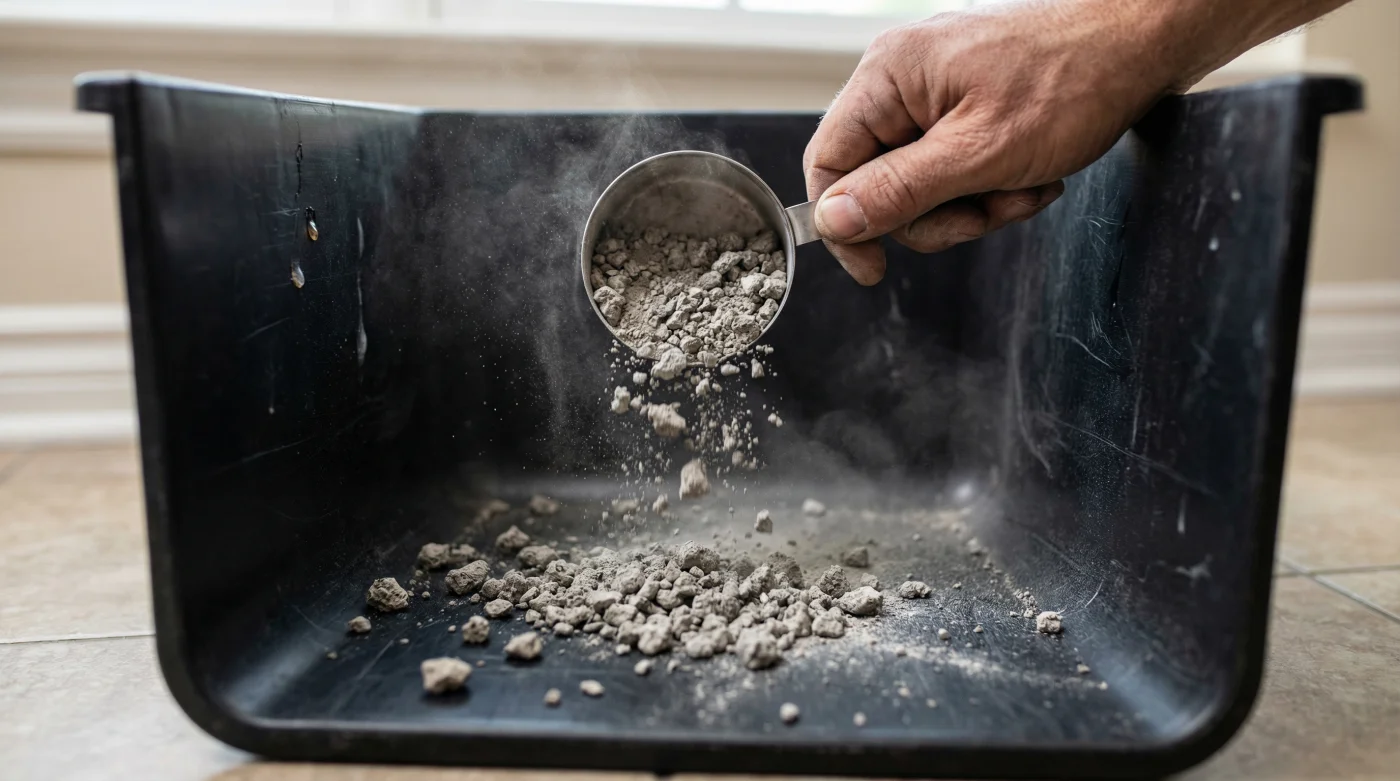 Once you bring it back inside, do not put the bag in yet. Instead, measure out half a cup of unscented, non-clumping clay litter. Pour it directly into the bottom of the hard plastic or metal bin.