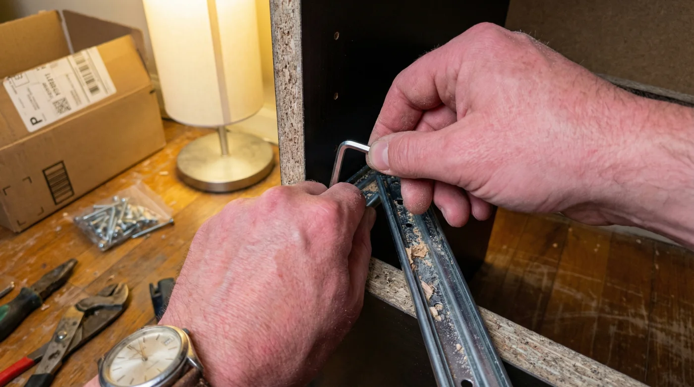 | Cam Locks | Quarter-turn counter-clockwise with a manual screwdriver. Never use a power drill. | Medium: High risk of tearing the thin laminate finish if forced out at an angle. |