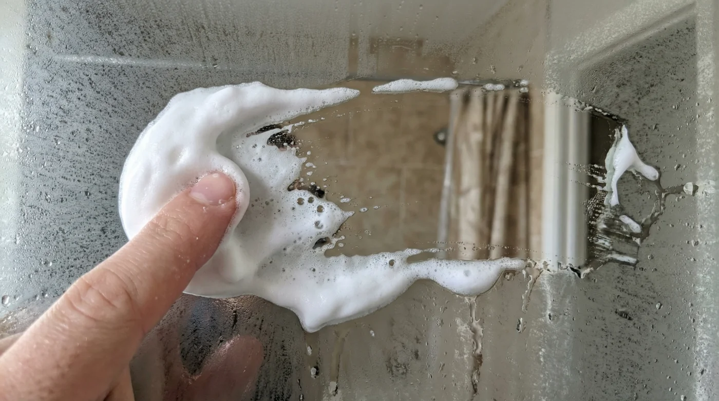 You do not need to alter the temperature of the room to stop this. You just need to change the glass. Foaming shaving cream is rich in surfactants—compounds that lower the surface tension of liquids. When you rub a thin layer into the mirror, it leaves behind an imperceptible film. Instead of forming microscopic droplets that blind the glass, moisture hits the surfactant and flattens out, sheeting off completely clear.