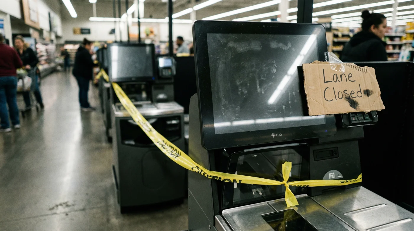 You hear the robotic voice before you even reach the front of the store. “Please place your item in the bagging area.” It is a familiar, slightly grating soundtrack to the modern errand run. The harsh fluorescent lights bounce off the plastic scanners, and you brace yourself for the inevitable red flashing light requiring an employee’s override. You expect to wrestle with a crinkled barcode on a bag of frozen peas while juggling your purse. But as you push your cart past the pharmacy today, the symphony of electronic beeps is missing. The self-checkout corral sits completely dark, cordoned off by a heavy metal barrier. The silence is sudden, and the physical space feels drastically different.